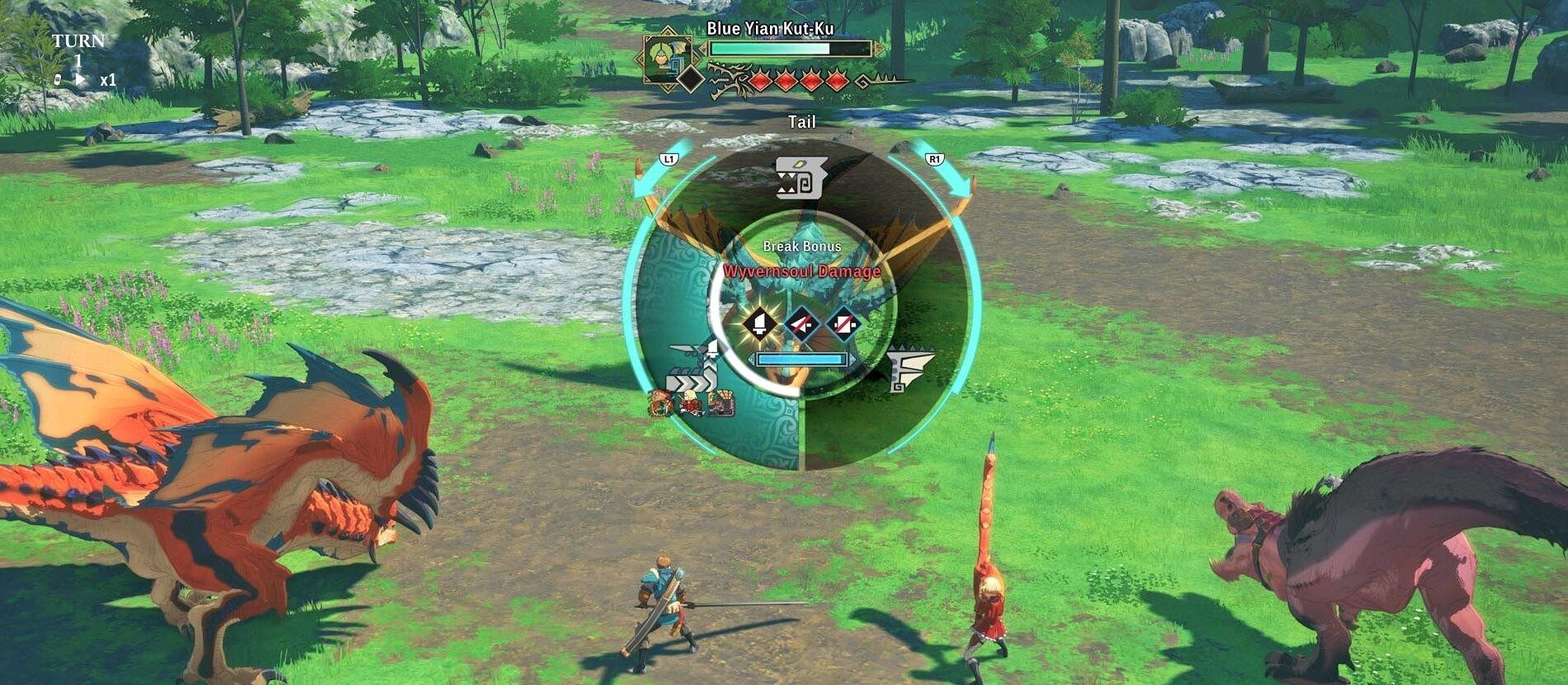 Ce n'est pas tout ! Il y a aussi la jauge d'amitié avec son Monstie, que l'on peut d'ailleurs changer à volonté parmi une équipe de 6, qui se remplit au cours du combat et qui permet de passer en mode monture en le chevauchant pour faire une attaque dévastatrice une fois pleine. Ah ! J'oubliais ! Je n’ai pas parlé de la jauge de posture des monstres ennemis qui doit être vidée pour mettre à terre un monstre afin de faire une attaque groupée à la Persona. Oui, comme vous pouvez le constater, c’est touffu mais tout cela retranscrit vraiment bien les sensations de combat du jeu de base, ce qui est un exploit pour du tour par tour.