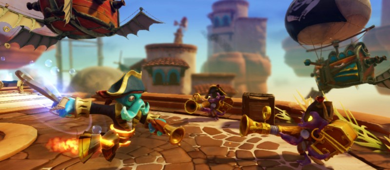 On retrouve les héros et vilains des épisodes précédents, catapultés dans un univers différent. Ils sont maintenant dans les nuages, entourés de pirates et de cowboys. Normal. Le scénario permettant d'introduire les nouveaux Skylanders explique qu'un volcan magique change les bestioles qui tombent dedans. Celles-ci peuvent maintenant fusionner les unes avec les autres, la feature principale de ce nouvel opus. Mais ce n'est pas tout puisque maintenant, les Skylanders peuvent aussi sauter. C'est con comme ça, mais cela rend le titre beaucoup plus dynamique et bien sûr offre de nouveaux mécanismes de gameplay. Les anciens persos étant maintenant dotés du saut, leurs capacités ont donc aussi été redéfinies. Les pouvoirs qu'ils ont conservé sont les mêmes, mais redesignés et donc beaucoup plus jolis. Nous avons fait la connaissance de nouveaux héros, tels que Magna, qui peut attirer à lui différents objets à distance pour les relancer sur ses ennemis. Il dispose d'un boost aussi, pour se déplacer plus rapidement et ainsi semer les méchants requins shérif à ses trousses.