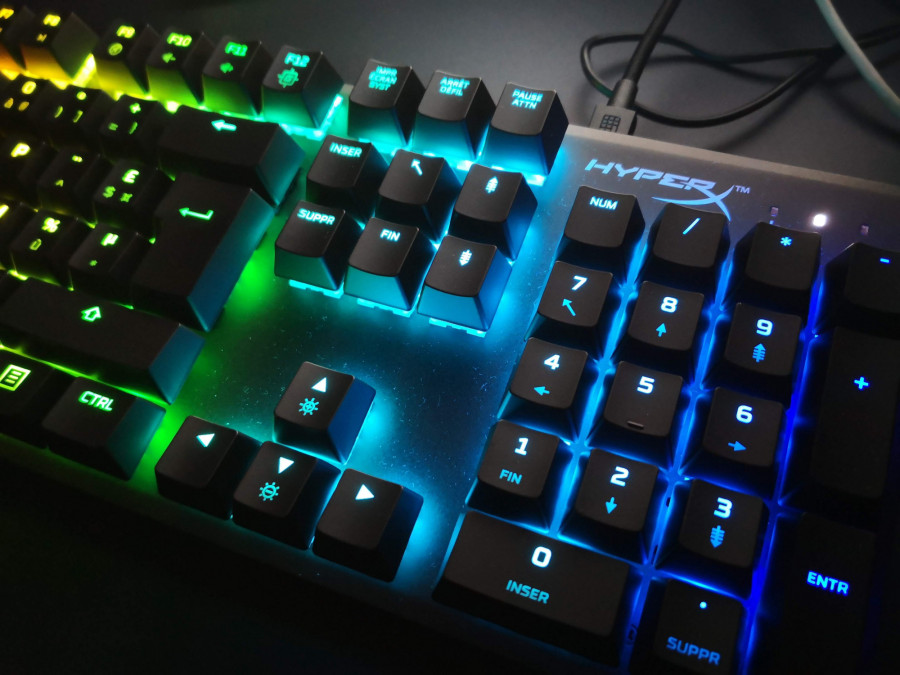 Côté touches, l’Alloy FPS RGB propose 105 touches surmontant des interrupteurs linéaires Kailh Silver Speed, avec une force d’actionnement de 40g, un point d’actionnement de 1,1mm et une distance d’actionnement totale de 3,5mm. Changeant radicalement de formule par rapport à l’emploi des switchs MX Cherry des autres claviers, l’Alloy FPS RGB fait office de petit OVNI dans la gamme des claviers HyperX. La pression des touches est agréable au toucher, mais un peu déconcertante lorsque l’on est habitué aux claviers mécaniques optant pour des switchs plus bruyants. En effet, la linéarité des Kailh Silver Speed a pour effet d’avoir une pression silencieuse sans le bruit de déclenchement et sans la sensation de cliquetis sous les doigts. La résistance de (seulement) 40g nous ferait presque croire que l’on teste un clavier à membrane plutôt qu’un clavier mécanique. Même si la norme est maintenant bien installée, il est toujours bon de préciser que les touches peuvent supporter jusqu’à 70 millions de pressions, dispose d’une technologie anti-ghosting à 100% (le fait de dissocier pression de ligne et colonne sur le clavier et éviter l’affichage de touches « fantôme »), du mode N-Key pour le Key Rollover (pouvoir appuyer jusqu’à 6 touches en même temps) ainsi que d’un taux de transfert de 1000Hz. Pas de fantaisies au niveau des touches supplémentaires multimédia ou d’une quelconque interface sur le clavier : histoire d’économiser de la place, les éventuelles interactions avec vos logiciels de lecture multimédia se feront via les touches du clavier et la combinaison de la touche FN. C’est également de cette manière que vous pourrez rapidement allumer ou éteindre les LED RGB présentes sous les switchs.