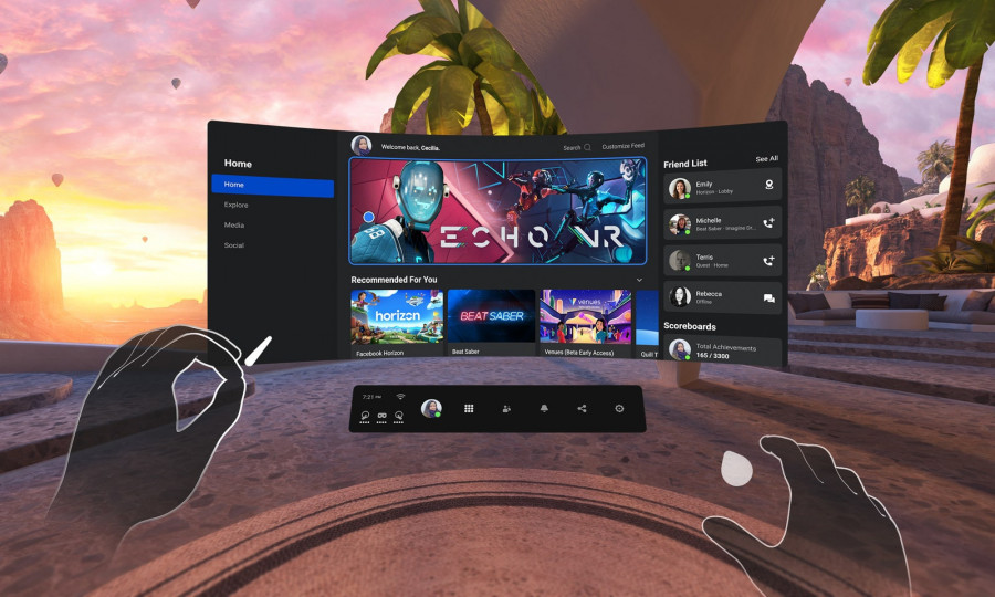 Outre vos contrôleurs, l’Oculus Quest 2 est équipé d’un « hand tracking » vous permettant de contrôler l’interface de votre casque uniquement à l’aide de vos mains. Pour ce faire, il suffit d’activer la fonction dans les menus et de placer les mains devant le casque. Ces dernières sont détectées automatiquement et vous pourrez lancer des actions ou naviguer dans des menus avec vos doigts. Hélas, si l’idée est excellente et la détection plus que correcte, on aura un peu de mal à cliquer au bon endroit de manière parfaitement fluide, ou par exemple de taper sur le clavier virtuel avec aise. Il reste encore du travail à faire de ce côté-là.