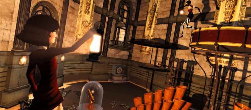 Zelda : A Link Between Two Worlds. Mais là où le héros d'Hyrule voit sa palette de mouvements diminuée dans cette position, la jeune demoiselle peut toujours bondir, se servant des ombres projetées sur les murs comme autant de plateformes. Et c'est d'ailleurs sur les ombres que se sont basées les deux énigmes de la démo présentée. Pas franchement stimulante sur le plan intellectuel, la première se déroulait dans une salle de concert et consistait à orienter des projecteurs pour faire apparaître les membre d'un groupe de jazz et ainsi révéler la sortie. La deuxième était déjà plus complexe. Il s'agissait ici de récolter des orbes lumineuses pour activer une machine et ainsi, créer des ombres qui nous permettront de sortir de la zone.