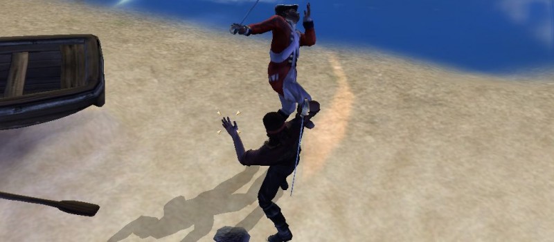 Graphismes moyens, animations pachydermiques, interactions avec le décor absentes, beaucoup de failles dans la réalisation vous en conviendrez. Mais en fait, vu le prix auquel vous avez achetez le jeu, tout cela est bien pardonnable. A croire que finalement, il n’est pas besoin d’une réalisation aux petits oignons pour s’amuser. Mais ça fait mal de dire ça, car ça encourage à continuer dans ce sens là. En jouant à Tortuga, tout ce je souhaite, c’est qu’il fasse une suite avec une réalisation à la hauteur. Parce que oui, après avoir regardé une 78ème fois Pirates des Caraibes 1 (qu’est ce qu’il y a ? Oui je suis fan !), lancer Tortuga est un grand plaisir : les phases de bastons, qui constituent la moitié du gameplay du jeu, sont très bourrines, très simples d’accès, très défoulantes, et pas réalistes pour un sous. Et non, effectivement, ça n’a rien à voir avec les scènes d’actions des films de Sparrow, mais bon. Pareil pour les phases en bateau, qui sont un peu plus proches du spectacle cinématographique, mais toujours un trop bourrin puisque vous coulerez parfois 10 navires à vous tout seul. Le pilotage est simplifié à la gestion de deux vitesse (toutes les voiles, la moitié, ou aucunes), et se placer en position de combat (canons vers le côté du navire ennemi) est aisé. On n’a plus qu’à choisir quels cannons armer parmi un panel judicieux.