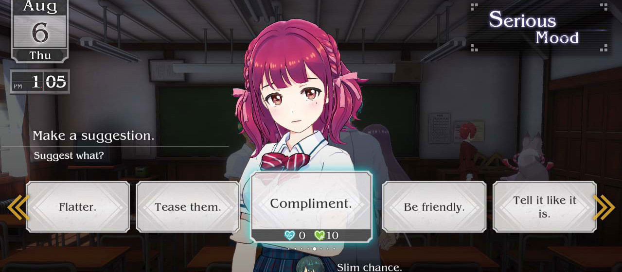 Sur le papier, ce scénario a tout pour plaire, en tout cas si on est fan du genre. Malheureusement, dans les faits, Loop8 ne parvient jamais à intéresser le joueur, la faute tout d'abord à une écriture hyper lourde qui met trop de temps à déployer son potentiel. Elle n'est pas non-plus aidée par les personnages qui se montrent tous plus ou moins inintéressants et secondaires. Ce qui est franchement cocasse quand on sait que ce RPG inclut un système de liens sociaux à la Persona : il est important de discuter avec les habitants pour devenir ami avec et bénéficier de divers bonus en combat. Mais là encore, c'est un échec critique tant ce système est obscur et que les discussions sont insipides. Sans parler de celles qui se répêtent encore et encore à chaque nouvelle boucle temporelle...